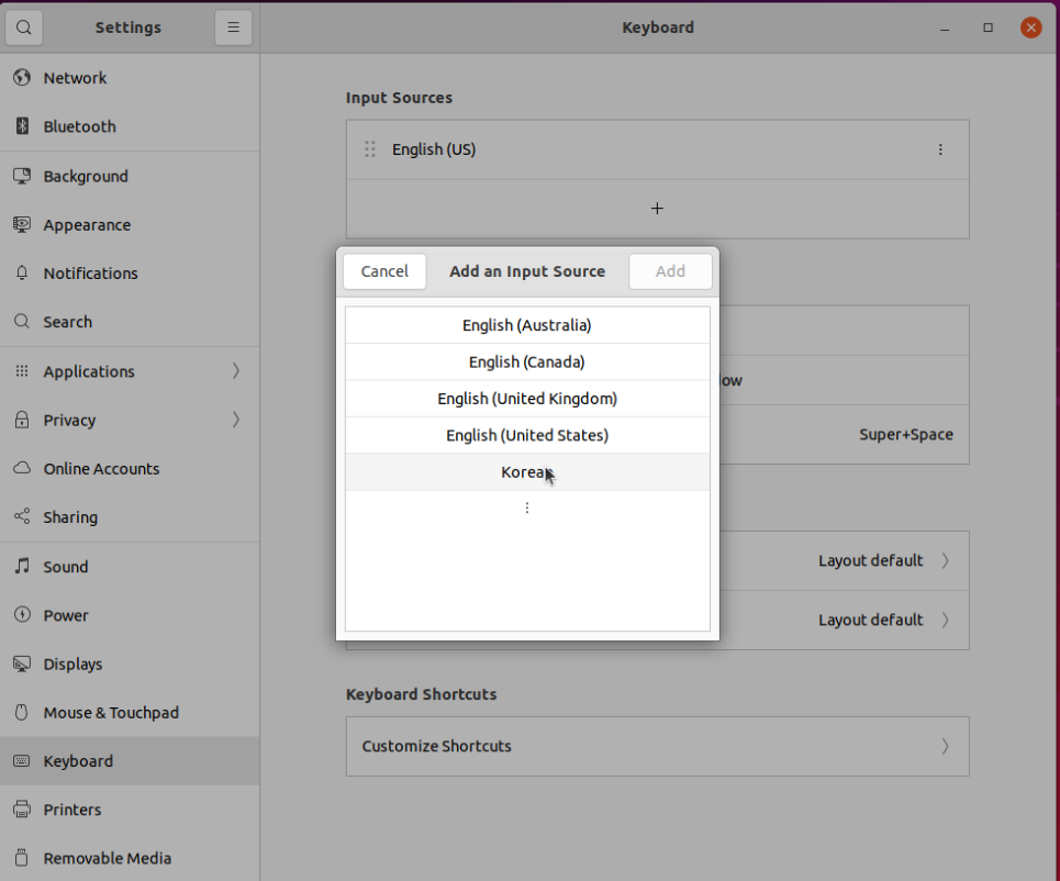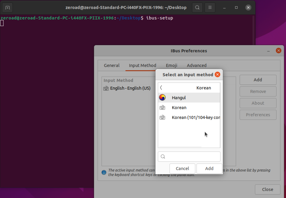 - 설치시 영어로만 설치 하고 추후 한글을 입력할 때 아래와 같이 ibus-setup->InputMethod로 한글 추가할 수 있음.